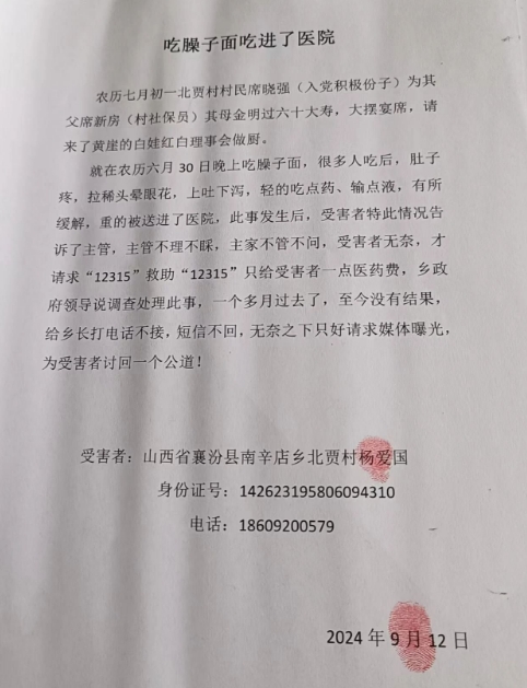 就在農(nóng)歷六月30日晚上吃臊子面,很多人吃后,肚子疼,拉稀頭暈眼花,上吐下瀉,輕的吃點藥、輸點液,有所緩解,重的被送進了醫(yī)院,此事發(fā)生后,受害者特此情況告訴了主管,主管不理不睬,主家不管不問,受害者無奈,才請求"12315"救助,"12315"只給受害者一點醫(yī)藥費,鄉(xiāng)政府領(lǐng)導(dǎo)說調(diào)查處理此事,一個多月過去了,至今沒有結(jié)果,給鄉(xiāng)長打電話不接,短信不回,無奈之下只好請求媒體曝光,為受害者討回一個公道!