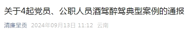 9月14日,湖南“清廉永州”發(fā)布《永州市紀(jì)委監(jiān)委通報4起黨員干部和公職人員酒后駕車典型問題》。