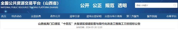 9月26日,山西省公共資源交易平臺(tái)發(fā)布一則招標(biāo)公告,山西省禹門(mén)口灌區(qū)“十四五”大型灌區(qū)續(xù)建配套與現(xiàn)代化改造工程施工三標(biāo)開(kāi)始招標(biāo)。