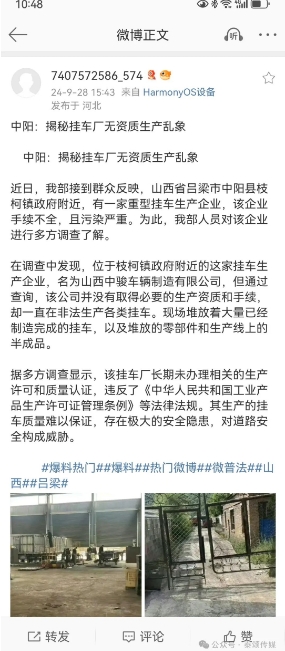 近日,我部接到群眾反映,山西省呂梁市中陽縣枝柯鎮(zhèn)政府附近,有一家重型掛車生產(chǎn)企業(yè),該企業(yè)手續(xù)不全,且污染嚴重。為此,我部人員對該企業(yè)進行多方調(diào)查了解。