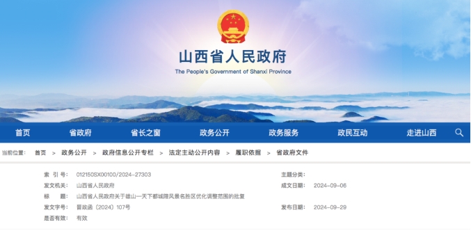 二、按照國務院《風景名勝區(qū)條例》(國務院令第474號)及《山西省風景名勝區(qū)條例》有關規(guī)定,你市在組織優(yōu)化調整風景名勝區(qū)范圍過程中,已征求相關權益人意見,妥善處理了矛盾沖突,各項措施已落實到位。你市要嚴格按照調整后的范圍及邊界,依據(jù)相關規(guī)范加快組織編制風景名勝區(qū)總體規(guī)劃,做好與當?shù)貒量臻g總體規(guī)劃及詳細規(guī)劃、專項規(guī)劃的銜接。要按照調整后范圍設立界碑并設置路標、安全警示等標識標牌,規(guī)范管理。