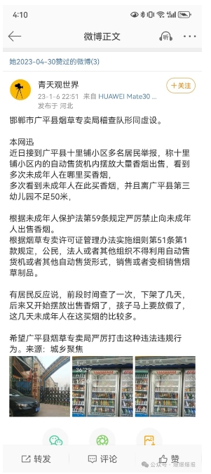 近日接到廣平縣十里鋪小區(qū)多名居民舉報,稱十里鋪小區(qū)內(nèi)的自動售貨機內(nèi)擺放大量香煙出售,看到多次未成年人在哪里買香煙,