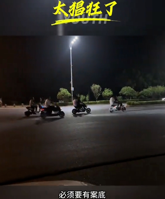 一群年輕人騎著電摩高速行駛,不時有翹頭、旋轉(zhuǎn)漂移的危險(xiǎn)動作,甚至還有人在現(xiàn)場放起了煙花,似乎在慶祝什么。