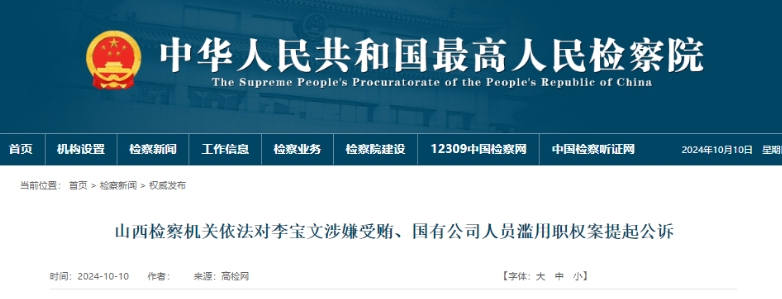 10月10日,據(jù)最高檢消息,山西檢察機(jī)關(guān)依法對(duì)李寶文涉嫌受賄、國有公司人員濫用職權(quán)案提起公訴。