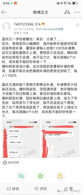 爆料網(wǎng)友吐槽:現(xiàn)在每周日都還要上課,說為了學生好,既然是為了學生好,就不應該收這個費用,收了這個費用性質(zhì)就變了,再說現(xiàn)在孩子上課壓力也大,每天就睡6個小時,周末都不能好好休息一下。