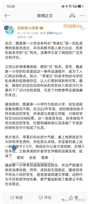 之所以炒得沸沸揚(yáng)揚(yáng),都和“紅”有關(guān)。首先,魏縣第一小學(xué)的知名度因這一事件迅速提升,成為了人們熱議的焦點(diǎn)。其次,“李某紅”的名字恰好與學(xué)校亂收費(fèi)的信息相呼應(yīng),讓人們感到諷刺和可笑。最后,網(wǎng)民們對(duì)這位總務(wù)科長(zhǎng)的灰色收入和貪污行為展開(kāi)了廣泛討論和質(zhì)疑,引發(fā)了對(duì)教育界反腐倡廉的關(guān)注。