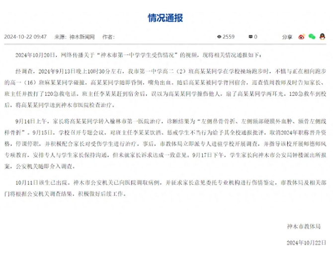 10月11日該生已出院。神木市公安機(jī)關(guān)已向醫(yī)院調(diào)取病例,并征求家長(zhǎng)意見(jiàn)委托專業(yè)機(jī)構(gòu)進(jìn)行傷情鑒定,市教體局及相關(guān)部門將根據(jù)公安機(jī)關(guān)調(diào)查結(jié)果,積極做好后續(xù)工作。
