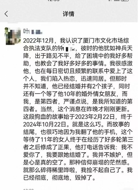 根據(jù)網(wǎng)傳朋友圈截圖顯示,女子在朋友圈稱,她與廈門市文化市場綜合執(zhí)法支隊鐘某相識于2022年12月,鐘某在困境中幫助她了很多,兩人后陷入熱戀并同居。后來,她知道鐘某已婚且有兩個孩子,還有一個等待其10年的婚外情女友,她是“第四者”。后來,鐘某要與第三者結(jié)婚。