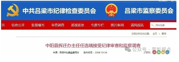中陽(yáng)縣拆遷辦主任任選瑞涉嫌嚴(yán)重違紀(jì)違法,目前正接受中陽(yáng)縣紀(jì)委監(jiān)委紀(jì)律審查和監(jiān)察調(diào)查。(中陽(yáng)縣紀(jì)委監(jiān)委)
