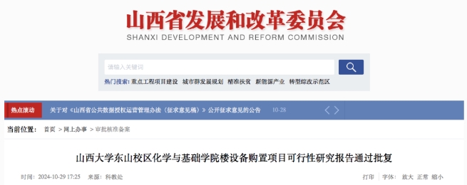 近日,省發(fā)改委以晉發(fā)改審批函〔2024〕385號(hào)批復(fù)了山西大學(xué)東山校區(qū)化學(xué)與基礎(chǔ)學(xué)院樓設(shè)備購(gòu)置項(xiàng)目可行性研究報(bào)告。主要內(nèi)容如下:
