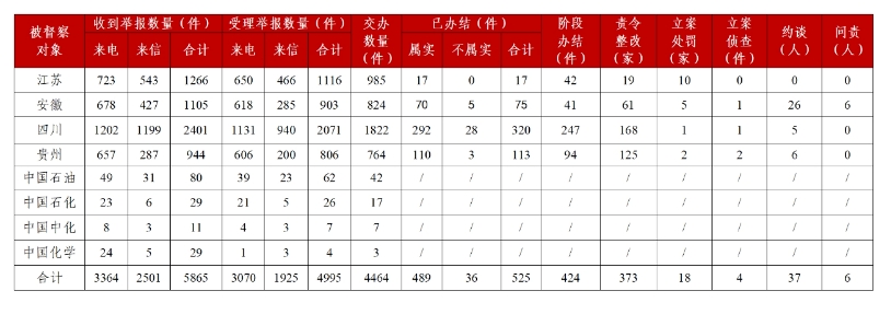 截至10月30日晚20:00,各督察組共收到群眾來電、來信舉報5865件,受理有效舉報4995件,經(jīng)梳理合并重復(fù)舉報,累計向被督察對象轉(zhuǎn)辦4464件;被督察對象已辦結(jié)或階段辦結(jié)949件,其中立案處罰18家;立案偵查4件;約談黨政領(lǐng)導干部37人,問責黨政領(lǐng)導干部6人。