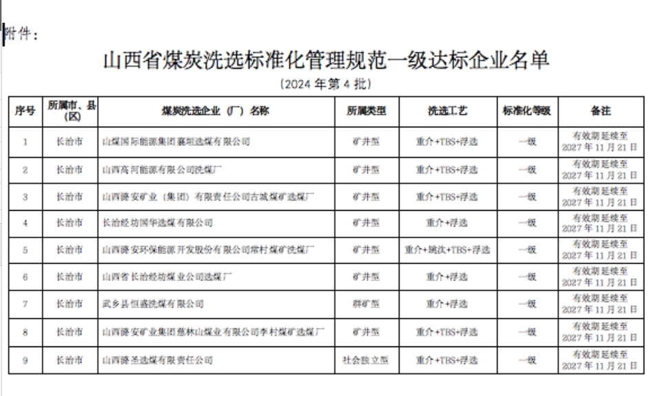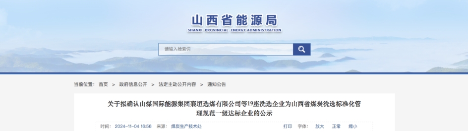 按照山西省地方標準《煤炭洗選企業(yè)標準化管理規(guī)范》和《煤炭洗選企業(yè)標準化管理規(guī)范考核評定辦法》有關(guān)規(guī)定,經(jīng)企業(yè)自評,省市縣能源局現(xiàn)場檢查,擬確認山煤國際能源集團襄垣選煤有限公司等19座洗選企業(yè)(見附件)為山西省煤炭洗選標準化管理規(guī)范一級達標企業(yè),現(xiàn)予公示,接受社會監(jiān)督。公示時間自2024年11月1日至11月7日。公示期內(nèi)如有異議,可書面或通過電子郵件向公示機關(guān)山西省能源局進行反映。