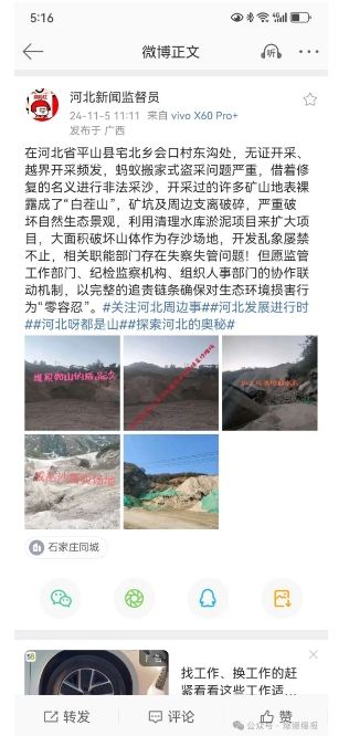 在河北省平山縣宅北鄉(xiāng)會(huì)口村東溝處,無證開采、越界開采頻發(fā),螞蟻搬家式盜采問題嚴(yán)重,借著修復(fù)的名義進(jìn)行非法采沙,開采過的許多礦山地表裸露成了“白茬山”,礦坑及周邊支離破碎,
