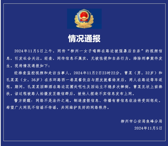 剛剛,廣西柳州市公安局魚峰分局通報:11月5日上午,網(wǎng)傳“柳州一女子喝醉在路邊被強暴后自殺”的視頻信息,引發(fā)社會關注。經(jīng)查,網(wǎng)傳信息不屬實,無被性侵和自殺行為,排除刑事案件發(fā)生。