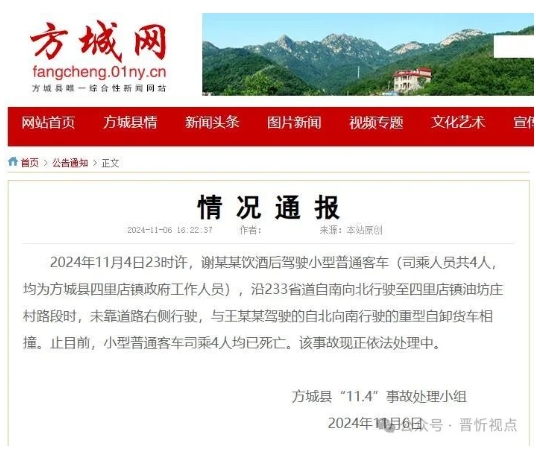 11月4日23時許,謝某某飲酒后駕駛小型普通客車(司乘人員共4人,均為方城縣四里店鎮(zhèn)政府工作人員),沿233省道自南向北行駛至四里店鎮(zhèn)油坊莊村路段時,未靠道路右側(cè)行駛,與王某某駕駛的自北向南行駛的重型自卸貨車相撞。止目前,小型普通客車司乘4人均已死亡。該事故現(xiàn)正依法處理中。