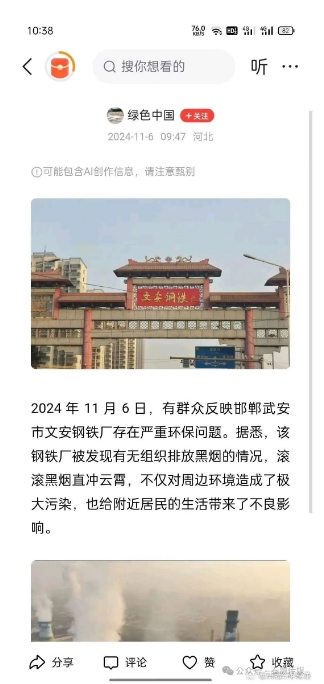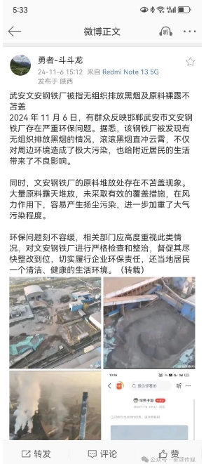 2024 年 11 月 6 日,有群眾反映邯鄲武安市文安鋼鐵廠存在嚴(yán)重環(huán)保問題。據(jù)悉,該鋼鐵廠被發(fā)現(xiàn)有無(wú)組織排放黑煙的情況,滾滾黑煙直沖云霄,不僅對(duì)周邊環(huán)境造成了極大污染,也給附近居民的生活帶來(lái)了不良影響。