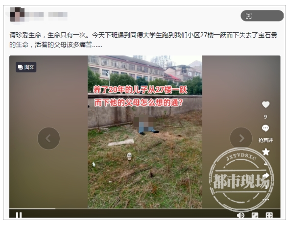 另?yè)?jù)一位網(wǎng)友發(fā)文稱(chēng),“今天下班遇到同德大學(xué)生跑到我們小區(qū)27樓一躍而下失去了寶貴生命?!?