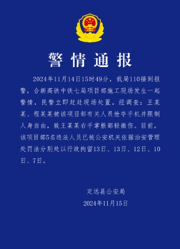 11月14日15時(shí)49分,定遠(yuǎn)縣公安局110接到報(bào)警,合新高鐵中鐵七局項(xiàng)目部施工現(xiàn)場發(fā)生一起警情,民警立即趕赴現(xiàn)場處置。