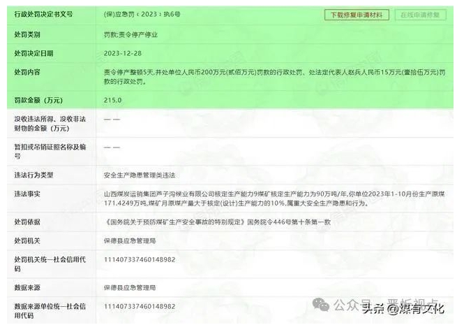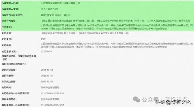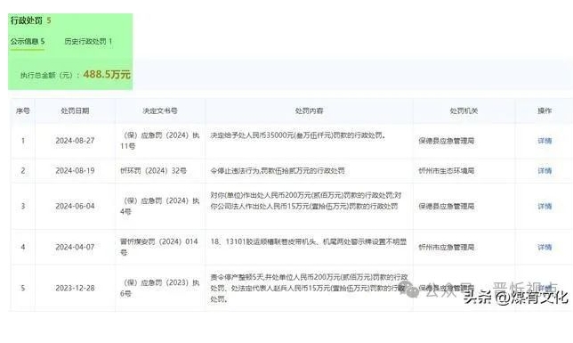 2024年4月7日,因安全生產(chǎn)違法違規(guī)行為被行政罰款3萬元。【行政處罰決定書文號:晉忻煤安罰﹝2024﹞014號】