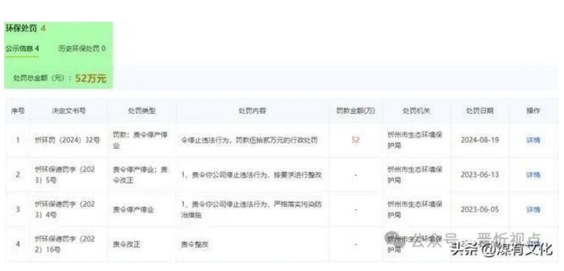 此外,2024年8月19日,公司初期雨水收集池內(nèi)雨水未經(jīng)處理直接排入蘆子溝河被行政罰款52萬元?!拘姓幜P決定書文號:忻環(huán)罰﹝2024﹞32號】