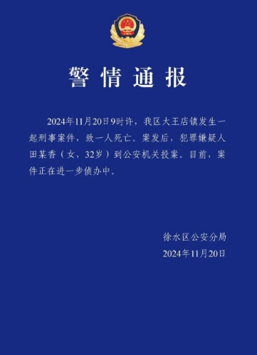 11月20日傍晚5點(diǎn)33分,保定市徐水區(qū)公安分局發(fā)布通報(bào)稱(chēng),11月20日9時(shí)許,該區(qū)大王店鎮(zhèn)發(fā)生一起刑事案件,致一人死亡。案發(fā)后,犯罪嫌疑人田某香(女,32歲)到公安機(jī)關(guān)投案。目前,案件正在進(jìn)一步偵辦中。