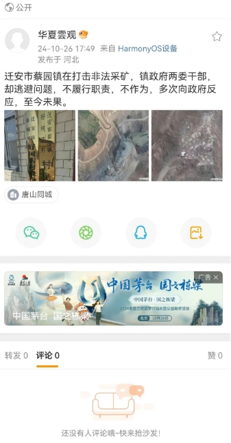 遷安市蔡園鎮(zhèn)在打擊非法采礦,鎮(zhèn)政府兩委干部,卻逃避問題,不履行職責(zé),不作為,多次向政府反應(yīng),至今未果。