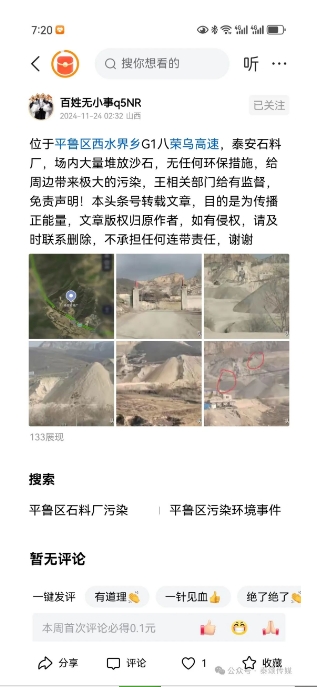 位于平魯區(qū)西水界鄉(xiāng)八榮烏高速,泰安石料廠,場(chǎng)內(nèi)大量堆放沙石,