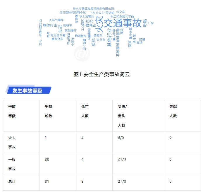 自2024-11-18 00:00:00至2024-11-24 23:59:59,全國報道安全生產(chǎn)類事故/事件共31起,(平臺推送8起,如需訂閱突發(fā)事件信息,請關(guān)注本文末端公眾號);跟蹤事故信息1起(跟蹤內(nèi)容可在“中國安全生產(chǎn)大數(shù)據(jù)平臺”網(wǎng)站的“突發(fā)事件”版塊查看,網(wǎng)址見本文末端),共造成死亡8人,受傷27人,其中重傷3人。詞云見圖1。