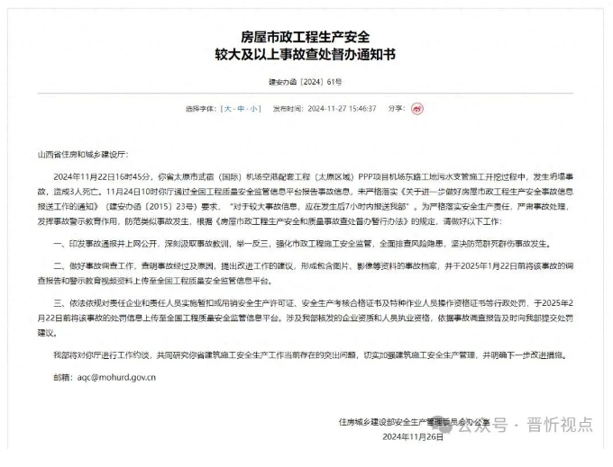 《通知書》提到,11月22日16時(shí)45分,山西省太原市武宿(國際)機(jī)場空港配套工程(太原區(qū)域)PPP項(xiàng)目機(jī)場東路工地污水支管施工開挖過程中,發(fā)生坍塌事故,造成3人死亡。11月24日10時(shí),山西省住房和城鄉(xiāng)建設(shè)廳通過全國工程質(zhì)量安全監(jiān)管信息平臺報(bào)告事故信息,未嚴(yán)格落實(shí)《關(guān)于進(jìn)一步做好房屋市政工程生產(chǎn)安全事故信息報(bào)送工作的通知》要求,“對于較大事故信息,應(yīng)在發(fā)生后7小時(shí)內(nèi)報(bào)送我部”。