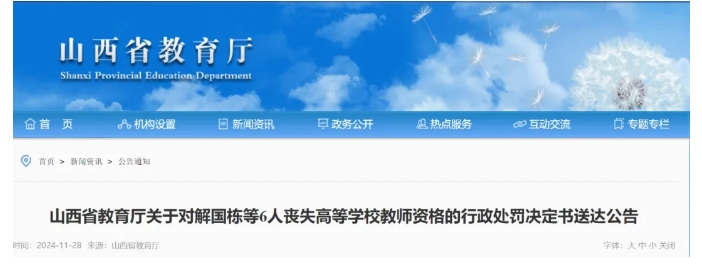 依據(jù)《中華人民共和國教師法》第十四條、《教師資格條例》第十八條、《〈教師資格條例〉實施辦法》第二十五條相關(guān)規(guī)定,山西省教育廳對解國棟等6人已作出喪失教師資格的行政處罰,解國棟等6人經(jīng)采取直接送達、委托送達等方式均無法送達行政處罰決定書,現(xiàn)依法公告送達,解國棟等6人公告信息如下。