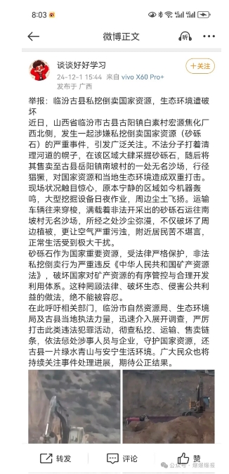 在此呼吁相關(guān)部門,臨汾市自然資源局、生態(tài)環(huán)境局及古縣當(dāng)?shù)貓?zhí)法力量,迅速介入展開調(diào)查,嚴(yán)厲打擊此類違法犯罪活動,徹查私挖、運(yùn)輸、售賣鏈條,依法懲處涉事人員與企業(yè),守護(hù)國家資源,還古縣一片綠水青山與安寧生活環(huán)境。廣大民眾也將持續(xù)關(guān)注事件處理進(jìn)展,期待公正結(jié)果。