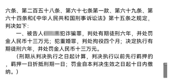 因犯詐騙罪、重婚罪,阿芳獲刑6年