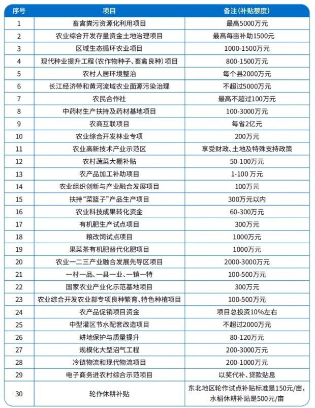 近日,財(cái)政部提前下達(dá)2025年中央財(cái)政銜接推進(jìn)鄉(xiāng)村振興補(bǔ)助資金,全國(guó)資金規(guī)模共計(jì)15930000萬(wàn)元??梢陨暾?qǐng)銜接推進(jìn)鄉(xiāng)村振興補(bǔ)助資金的項(xiàng)目,通常旨在加強(qiáng)鄉(xiāng)村產(chǎn)業(yè)發(fā)展、資源利用、旅游開(kāi)發(fā)以及改善農(nóng)村基礎(chǔ)設(shè)施和公共服務(wù)等。本文梳理了鄉(xiāng)村振興銜接示范區(qū)、鄉(xiāng)村振興集中推進(jìn)區(qū)、國(guó)家級(jí)農(nóng)業(yè)產(chǎn)業(yè)強(qiáng)鎮(zhèn)、國(guó)家級(jí)現(xiàn)代農(nóng)業(yè)產(chǎn)業(yè)園、國(guó)家級(jí)優(yōu)勢(shì)特色產(chǎn)業(yè)集群等15個(gè)重點(diǎn)申報(bào)項(xiàng)目、申報(bào)時(shí)間、申報(bào)主體、政策獎(jiǎng)勵(lì)等內(nèi)容,僅供參考。
