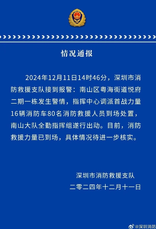 2024年12月11日14時(shí)46分,深圳市消防救援支隊(duì)接到報(bào)警:南山區(qū)粵海街道悅府二期一棟發(fā)生警情,指揮中心調(diào)派首戰(zhàn)力量16輛消防車(chē)80名消防救援人員到場(chǎng)處置,南山大隊(duì)全勤指揮組遂行出動(dòng)。目前,消防救援力量已到場(chǎng),具體情況待進(jìn)一步核實(shí)。