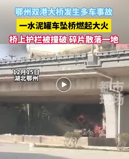 視頻顯示,目擊者駕車行駛過程中,黑煙裹挾著火光不斷升起。橋面有多車停靠一邊,橋上護(hù)欄被撞破,碎片散落一地。另一畫面中,一水泥罐車墜落橋底,消防救援人員已趕到現(xiàn)場進(jìn)行滅火。
