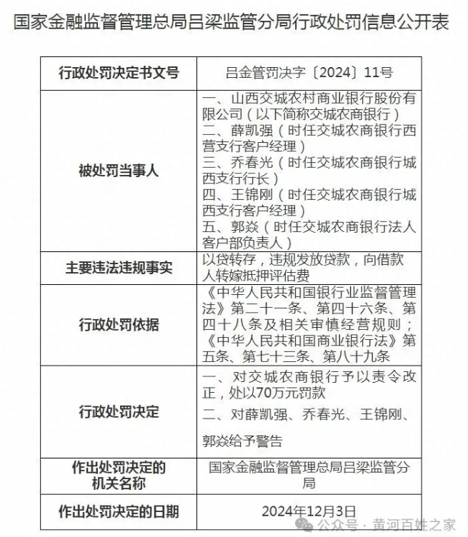 近日,據(jù)國(guó)家金融監(jiān)督管理總局呂梁監(jiān)管分局行政處罰信息公開表(呂金管罰決字〔2024〕11號(hào))顯示,山西交城農(nóng)村商業(yè)銀行股份有限公司(以下簡(jiǎn)稱交城農(nóng)商銀行)因以貸轉(zhuǎn)存、違規(guī)發(fā)放貸款、向借款人轉(zhuǎn)嫁抵押評(píng)估費(fèi)等被行政處罰依據(jù)《中華人民共和國(guó)銀行業(yè)監(jiān)督管理法》第二十一條、第四十六條、第四十八條及相關(guān)審慎經(jīng)營(yíng)規(guī)則;《中華人民共和國(guó)商業(yè)銀行法》第五條、第七十三條、第八十九條,行政處罰決定 :對(duì)交城農(nóng)商銀行予以責(zé)令改正,處以70萬元罰款。
