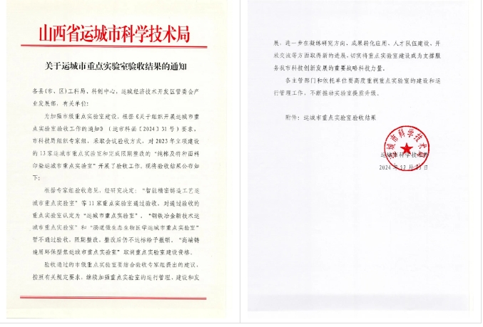 為加強(qiáng)市級重點(diǎn)實(shí)驗(yàn)室建設(shè),根據(jù)《關(guān)于組織開展運(yùn)城市重點(diǎn)實(shí)驗(yàn)室驗(yàn)收工作的通知》(運(yùn)市科函〔2024〕31號)要求,市科技局組織專家組,采取會(huì)議驗(yàn)收方式,對2023年立項(xiàng)建設(shè)的13家運(yùn)城市重點(diǎn)實(shí)驗(yàn)室和完成限期整改的“純棉及特種面料印染運(yùn)城市重點(diǎn)實(shí)驗(yàn)室”開展了驗(yàn)收工作?,F(xiàn)將驗(yàn)收結(jié)果公布如下:根據(jù)專家組驗(yàn)收意見,經(jīng)研究決定:“智能精密鑄造工藝運(yùn)城市重點(diǎn)實(shí)驗(yàn)室”等11家重點(diǎn)實(shí)驗(yàn)室通過驗(yàn)收,對通過驗(yàn)收的重點(diǎn)實(shí)驗(yàn)室認(rèn)定為“運(yùn)城市重點(diǎn)實(shí)驗(yàn)室”。“鋼鐵冶金新技術(shù)運(yùn)城市重點(diǎn)實(shí)驗(yàn)室”和“腸道微生態(tài)生物醫(yī)學(xué)運(yùn)城市重點(diǎn)實(shí)驗(yàn)室”暫不通過驗(yàn)收,限期整改,整改后仍不達(dá)標(biāo)給予撤銷?!案叨髓T造用環(huán)保型焦運(yùn)城市重點(diǎn)實(shí)驗(yàn)室”取消重點(diǎn)實(shí)驗(yàn)室建設(shè)資格。驗(yàn)收通過的市級重點(diǎn)實(shí)驗(yàn)室要結(jié)合驗(yàn)收專家組提出的建議,按照有關(guān)規(guī)定要求,繼續(xù)加強(qiáng)重點(diǎn)實(shí)驗(yàn)室的運(yùn)行管理、建設(shè)和發(fā)展,進(jìn)一步在凝練研究方向、成果轉(zhuǎn)化應(yīng)用、人才隊(duì)伍建設(shè)、開放交流等方面取得新的進(jìn)展,切實(shí)將重點(diǎn)實(shí)驗(yàn)室建設(shè)成為支撐服務(wù)我市科技創(chuàng)新發(fā)展的重要戰(zhàn)略科技力量。 各主管部門和依托單位要高度重視重點(diǎn)實(shí)驗(yàn)室的建設(shè)和運(yùn)行管理工作,不斷推動(dòng)實(shí)驗(yàn)室提質(zhì)升級。