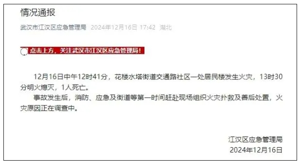 湖北武漢市江漢區(qū)應急管理局發(fā)布情況通報稱,12月16日中午12時41分,花樓水塔街道交通路社區(qū)一處居民樓發(fā)生火災,13時30分明火熄滅,1人死亡。事故發(fā)生后,消防、應急及街道等第一時間趕赴現(xiàn)場組織火災撲救及善后處置,火災原因正在調查中。