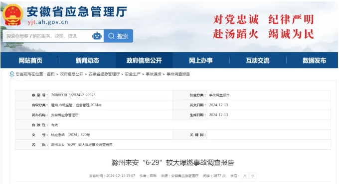 日前,安徽省應(yīng)急管理廳公布了《滁州來安“6·29”較大爆燃事故調(diào)查報告》。經(jīng)調(diào)查認定,該起較大爆燃事故是一起非法生產(chǎn)導(dǎo)致的生產(chǎn)安全責(zé)任事故。