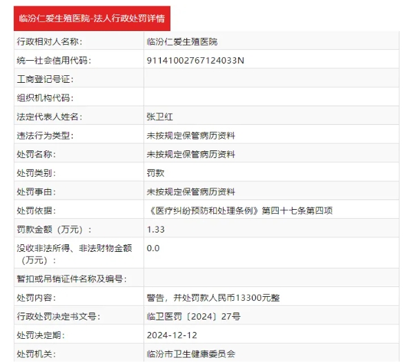 2024年12月12日,臨汾市衛(wèi)生健康委員會再次對臨汾仁愛生殖醫(yī)院開出重磅罰單,該醫(yī)院因未按規(guī)定保管病歷資料,被處以1.3萬元罰款。這一處罰依據(jù)為《醫(yī)療糾紛預(yù)防和處理條例》第四十七條第四項,凸顯了監(jiān)管部門對醫(yī)療規(guī)范管理的嚴(yán)格要求和堅決態(tài)度。
