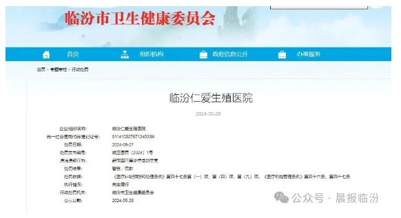 早在2024年9月4日,臨汾仁愛生殖醫(yī)院就曾因未按規(guī)定填寫病歷資料及未按照醫(yī)療衛(wèi)生相關(guān)法律、法規(guī)、規(guī)章的要求開展診療活動,被臨汾市衛(wèi)生健康委員會處以5萬元罰款,并收到警告。這一處罰同樣依據(jù)《醫(yī)療糾紛預(yù)防和處理條例》的相關(guān)規(guī)定,并進行了公示。