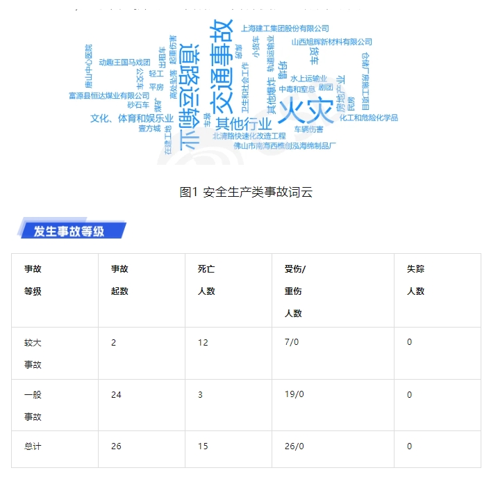 自2024-12-16 00:00:00至2024-12-22 23:59:59,全國報道安全生產(chǎn)類事故/事件共26起,(平臺推送0起,如需訂閱突發(fā)事件信息,請關(guān)注本文末端公眾號);跟蹤事故信息2起(跟蹤內(nèi)容可在“中國安全生產(chǎn)大數(shù)據(jù)平臺”網(wǎng)站的“突發(fā)事件”版塊查看,網(wǎng)址見本文末端),共造成死亡15人,受傷26人,其中重傷0人。詞云見圖1。