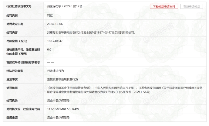 據(jù)信用中國官方網(wǎng)站,近日,江蘇昆山虹橋醫(yī)院有限公司因重復(fù)收費(fèi)等違規(guī)收費(fèi)行為,被昆山市醫(yī)療保障局罰款188萬余元。此前,該醫(yī)院曾因診療活動未嚴(yán)格遵守診療相關(guān)規(guī)范、常規(guī)等行政違法行為被罰。