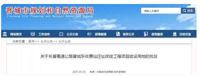 1月3日,晉城市規(guī)劃和自然資源局發(fā)布關(guān)于長(zhǎng)晉高速公路晉城東收費(fèi)站遷址改建工程項(xiàng)目建設(shè)用地的批復(fù)。