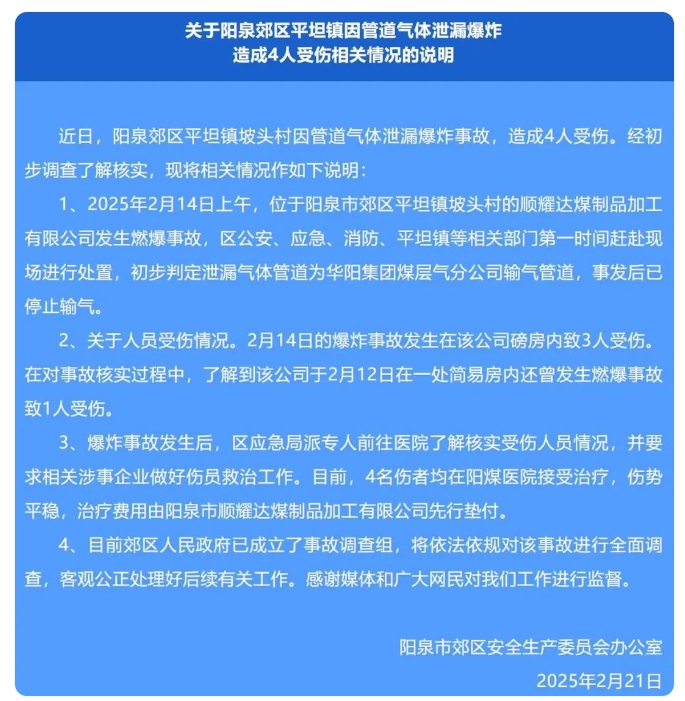 1、2025年2月14日上午,位于陽(yáng)泉市郊區(qū)平坦鎮(zhèn)坡頭村的順耀達(dá)煤制品加工有限公司發(fā)生燃爆事故,區(qū)公安、應(yīng)急、消防、平坦鎮(zhèn)等相關(guān)部門第一時(shí)間趕赴現(xiàn)場(chǎng)進(jìn)行處置,初步判定泄漏氣體管道為華陽(yáng)集團(tuán)煤層氣分公司輸氣管道,事發(fā)后已停止輸氣。