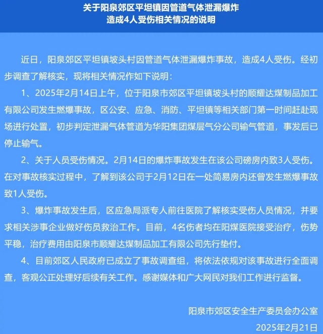 2月21日,山西陽泉市郊區(qū)安全生產(chǎn)委員會辦公室發(fā)布情況說明: