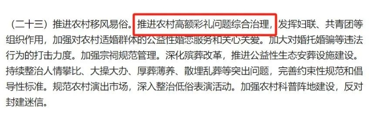 農村高額彩禮不是新問題。這幾年,中央一號文件持續(xù)部署破解之策。比如,2022年的文件提出,“開展高價彩禮、大操大辦等移風易俗重點領域突出問題專項治理”。2023年的文件提出,“強化村規(guī)民約約束作用,黨員、干部帶頭示范,扎實開展高價彩禮、大操大辦等重點領域突出問題專項治理”。2024年的文件提出“鼓勵各地利用鄉(xiāng)村綜合性服務場所,為農民婚喪嫁娶等提供普惠性社會服務,降低農村人情負擔”。