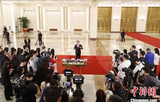 3月8日,十四屆全國人大三次會議第二場“部長通道”集中采訪活動在北京人民大會堂舉行,中國農業(yè)農村部部長韓俊接受采訪?!≈行律缬浾?韓海丹 攝