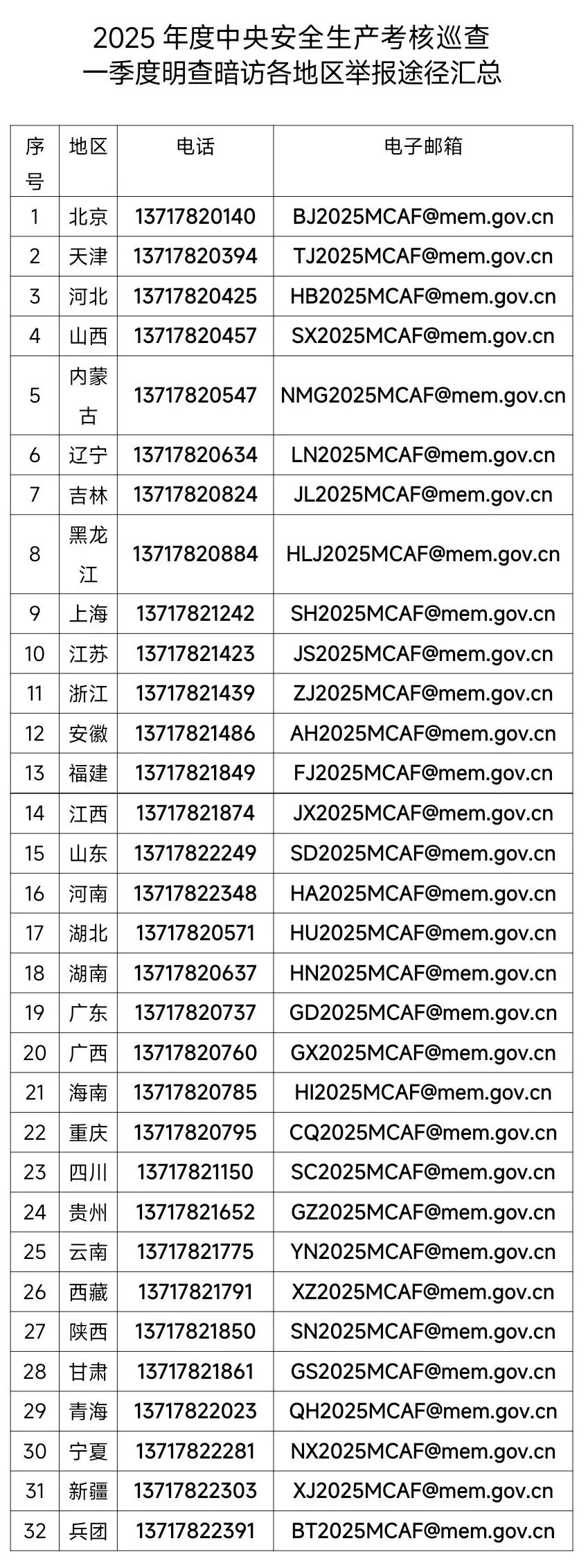 附件:2025 年度中央安全生產(chǎn)考核巡查一季度明查暗訪各地區(qū)舉報(bào)途徑匯總