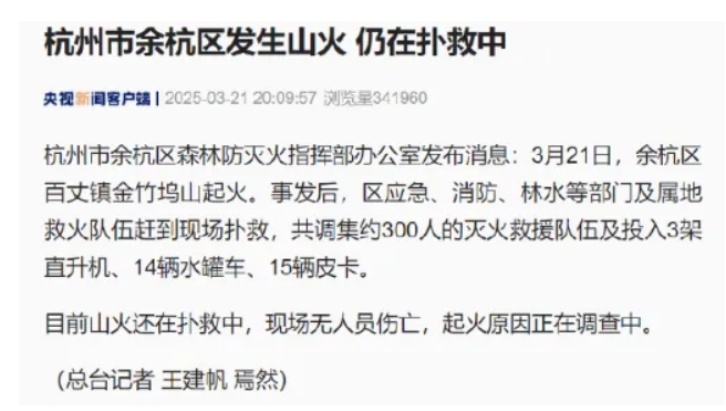 杭州市余杭區(qū)森林防滅火指揮部辦公室發(fā)布消息:3月21日,余杭區(qū)百丈鎮(zhèn)金竹塢山起火。事發(fā)后,區(qū)應(yīng)急、消防、林水等部門及屬地救火隊伍趕到現(xiàn)場撲救,共調(diào)集約300人的滅火救援隊伍及投入3架直升機、14輛水罐車、15輛皮卡。目前山火還在撲救中,現(xiàn)場無人員傷亡,起火原因正在調(diào)查中。